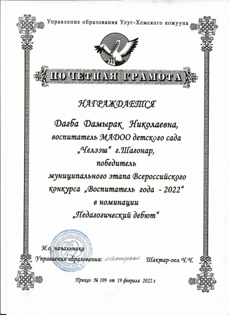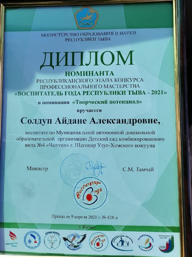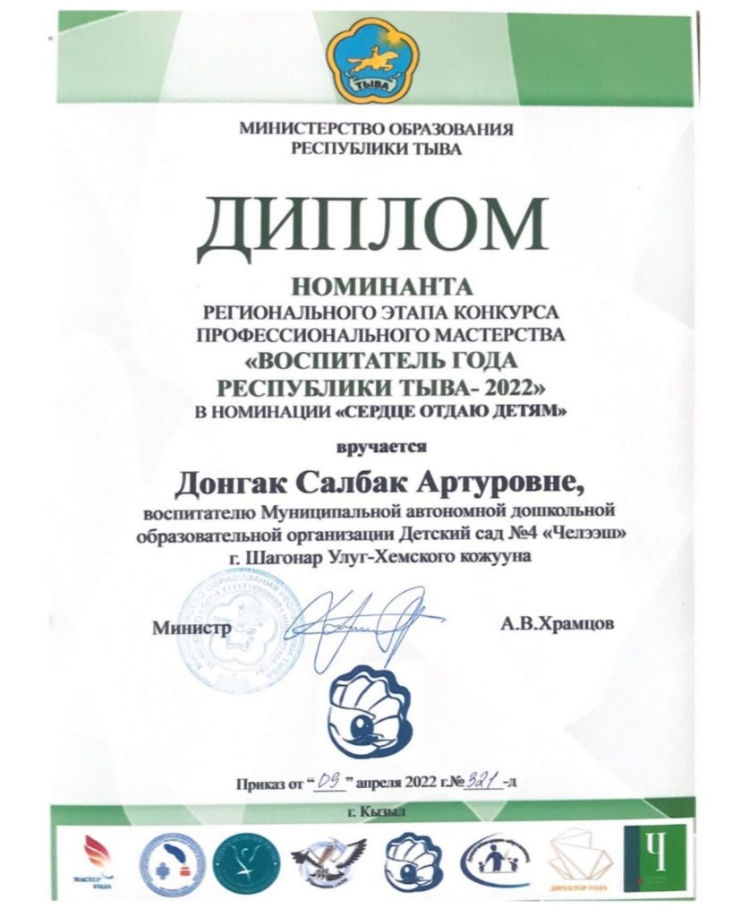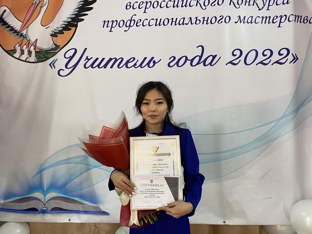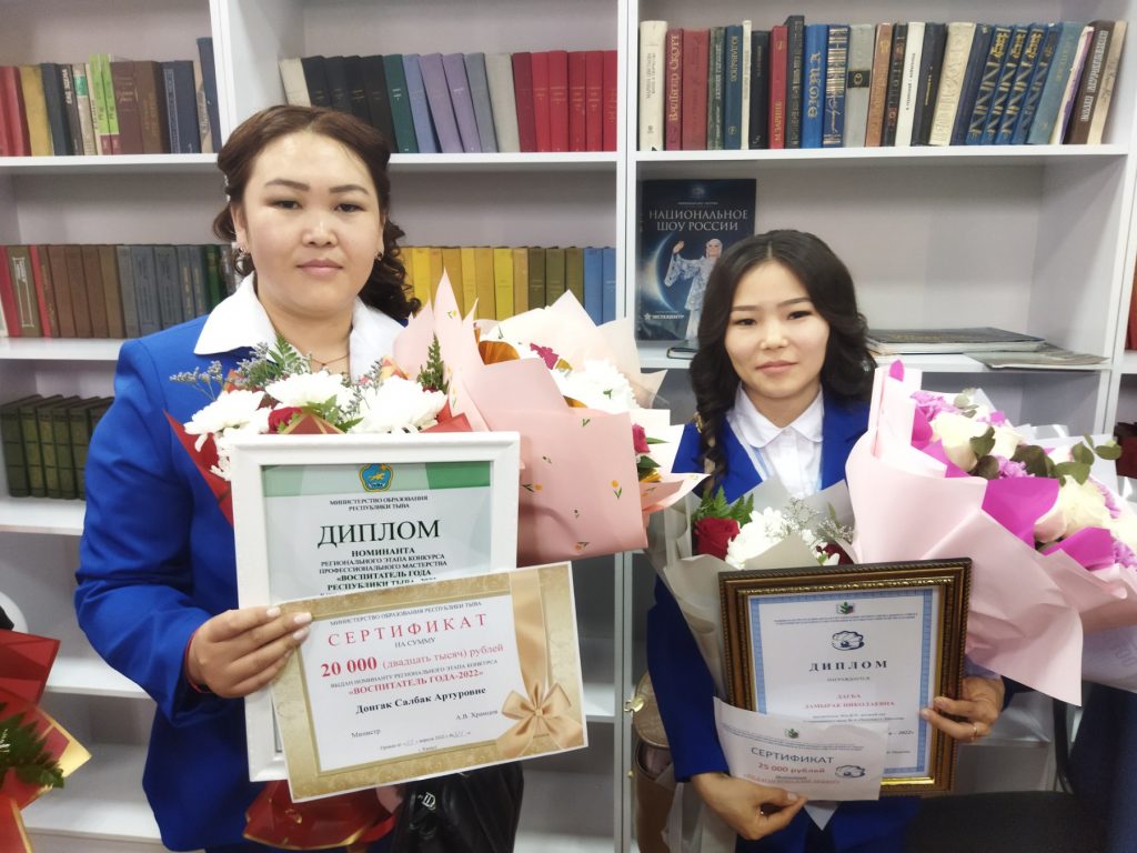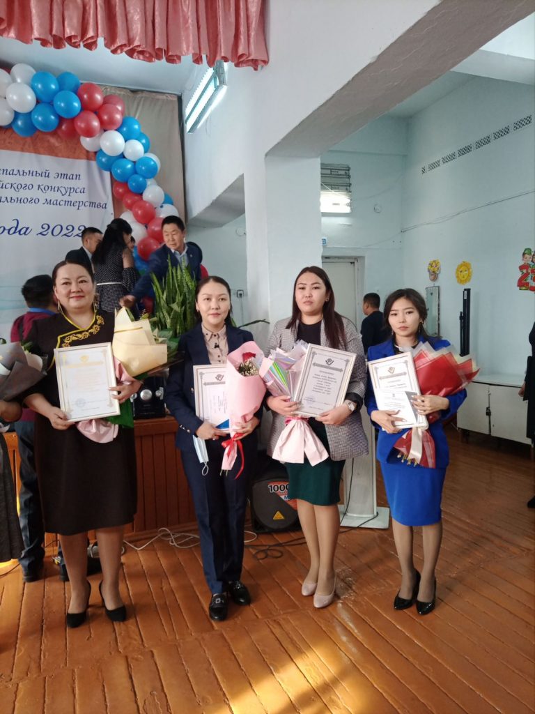 С 14 по 18 февраля 2022 года проходил конкурс профессионального мастерства муниципального этапа «Воспитатель года — 2022» Улуг-Хемского района. На конкурс от нашего детского сада были представлены победитель внутрисадовского этапа, воспитатель младшей группы «Алдын-Булак» Донгак Салбак Артуровна и в номинации «Педагогический дебют» молодой педагог Дагба Дамырак Николаевна.