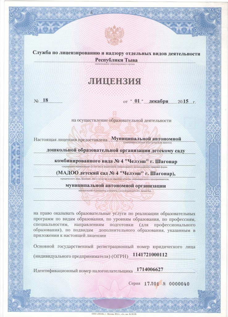 лицензия на осуществление образовательной деятельности № 18 от 01 декабря 2015 г.